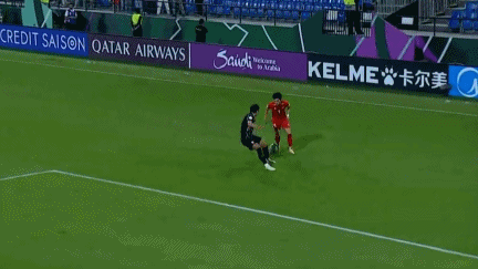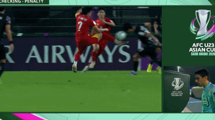 然而,仅仅过了4分钟,第34分钟,在韩国队开出角球之后,阮庭北禁区内解围,赵炫泰倒地,主裁判判罚点球。随后,视频助理裁判介入判罚,并且要求主裁判回看慢镜头。